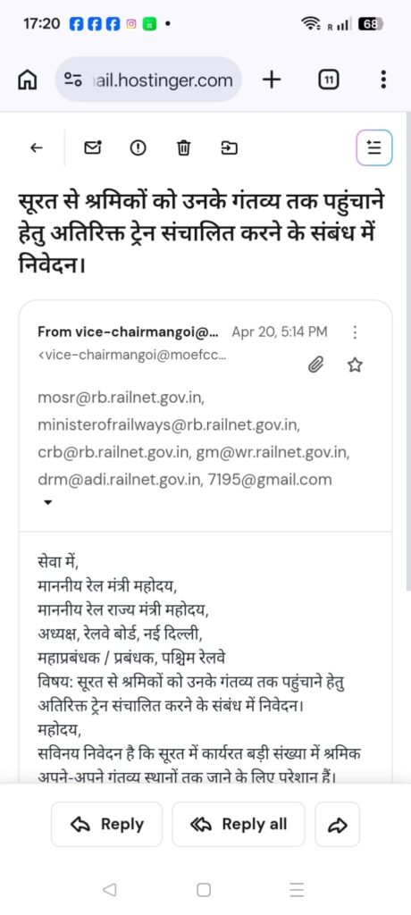 साथ ही, माननीय रेल मंत्री, रेलवे बोर्ड के अध्यक्ष एवं रेलवे के वरिष्ठ अधिकारियों से आग्रह किया गया है कि श्रमिकों की बढ़ती संख्या को देखते हुए तत्काल अतिरिक्त स्पेशल ट्रेनों का संचालन किया जाए ताकि सभी श्रमिकों को सुरक्षित एवं सम्मानपूर्वक उनके गंतव्य तक पहुंचाया जा सके।
